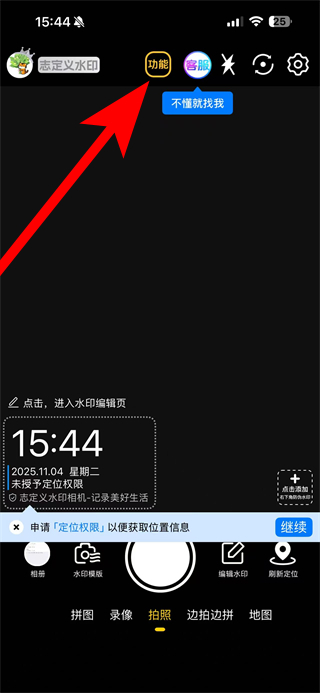 1、打开自定义水印相机APP,点击上方功能按钮,进入功能选择页面。