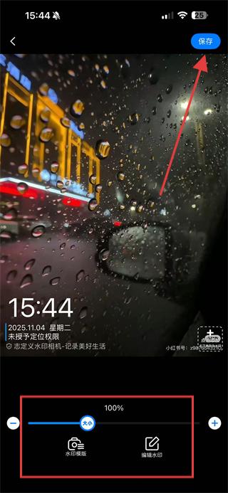 4、图片选择后,可在下方调整水印大小、选择水印模板、编辑水印等,完成后点击右上角保存,即可给图片添加水印文字。
