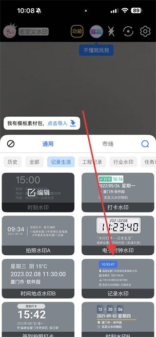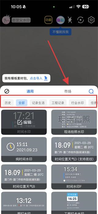 2、在水印模板选择页面中,可切换通用、市场等分类,或选择记录生活、工程记录等细分类型,挑选不同的水印模式。