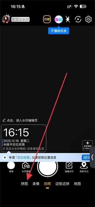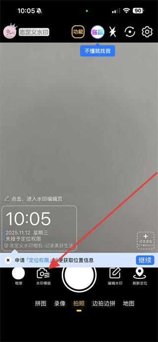 1、打开自定义水印相机app,在拍摄界面点击底部的拼图选项,进入拼图模板页面。