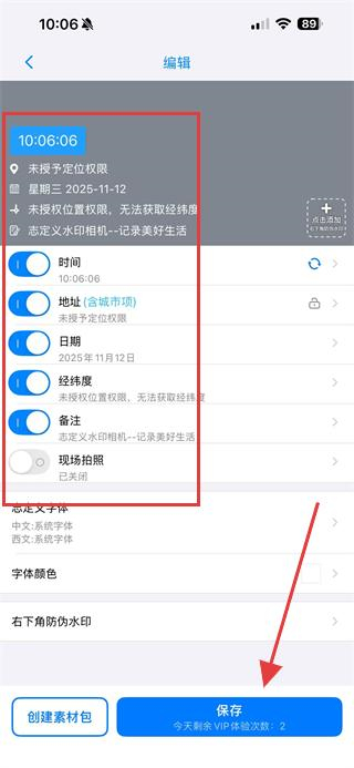 3、选择好水印模式后,进入编辑页面,可调整时间、地址、日期等水印参数。