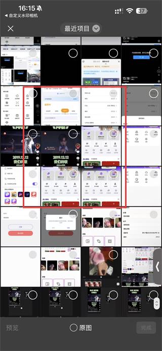 3、在图片添加页面点击加号点击添加图片,进入最近项目页面后选择需要添加水印的图片。