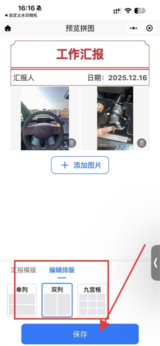 4、在拼图预览页面,可通过“编辑排版”选择拼图样式如单列、双列、九宫格,确认排版后点击底部的保存按钮,即可完成照片拼图。