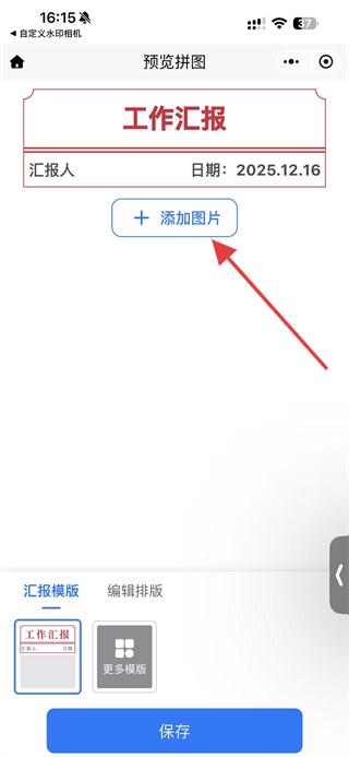 2、在拼图模板页面如工作汇报模板,点击+添加图片按钮,进入相册选择照片。
