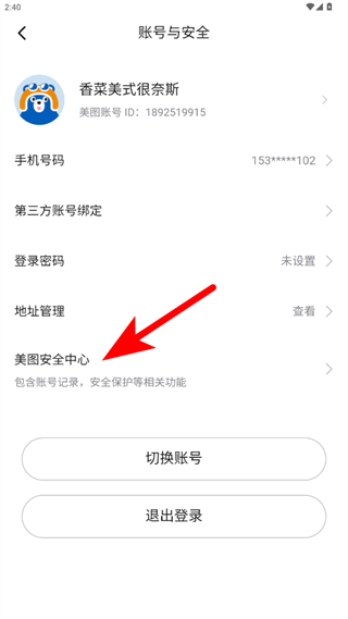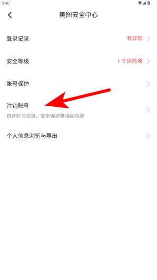 5、进入美图安全中心页面后点击注销账号,即可注销美颜相机账号。