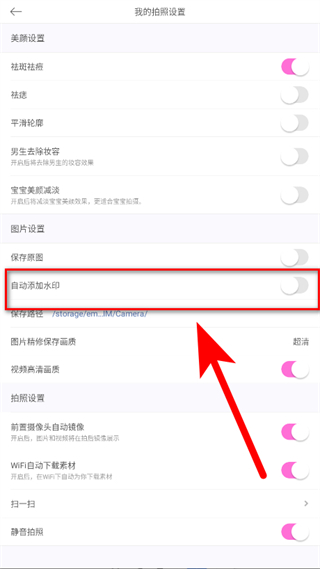 4、在我的拍照设置页面找到自动添加水印选项,开启该功能,即可在美颜相机中添加水印。