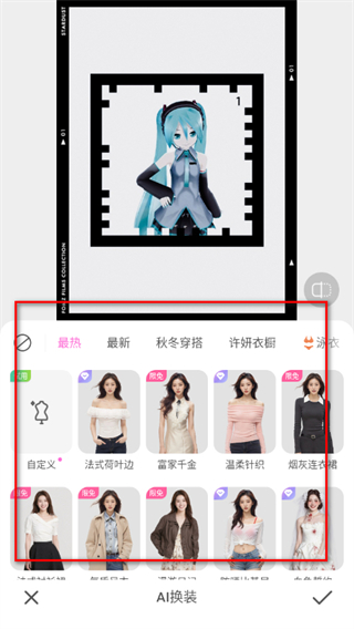 3、在AI换装设置页面选择喜欢的服装样式,完成服装更换。