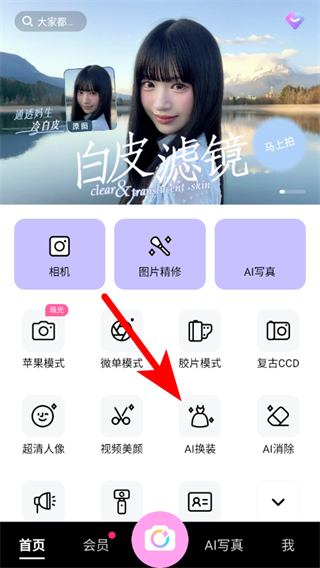 1、打开美颜相机APP,在首页找到AI换装选项并点击,进入图片选择页面。