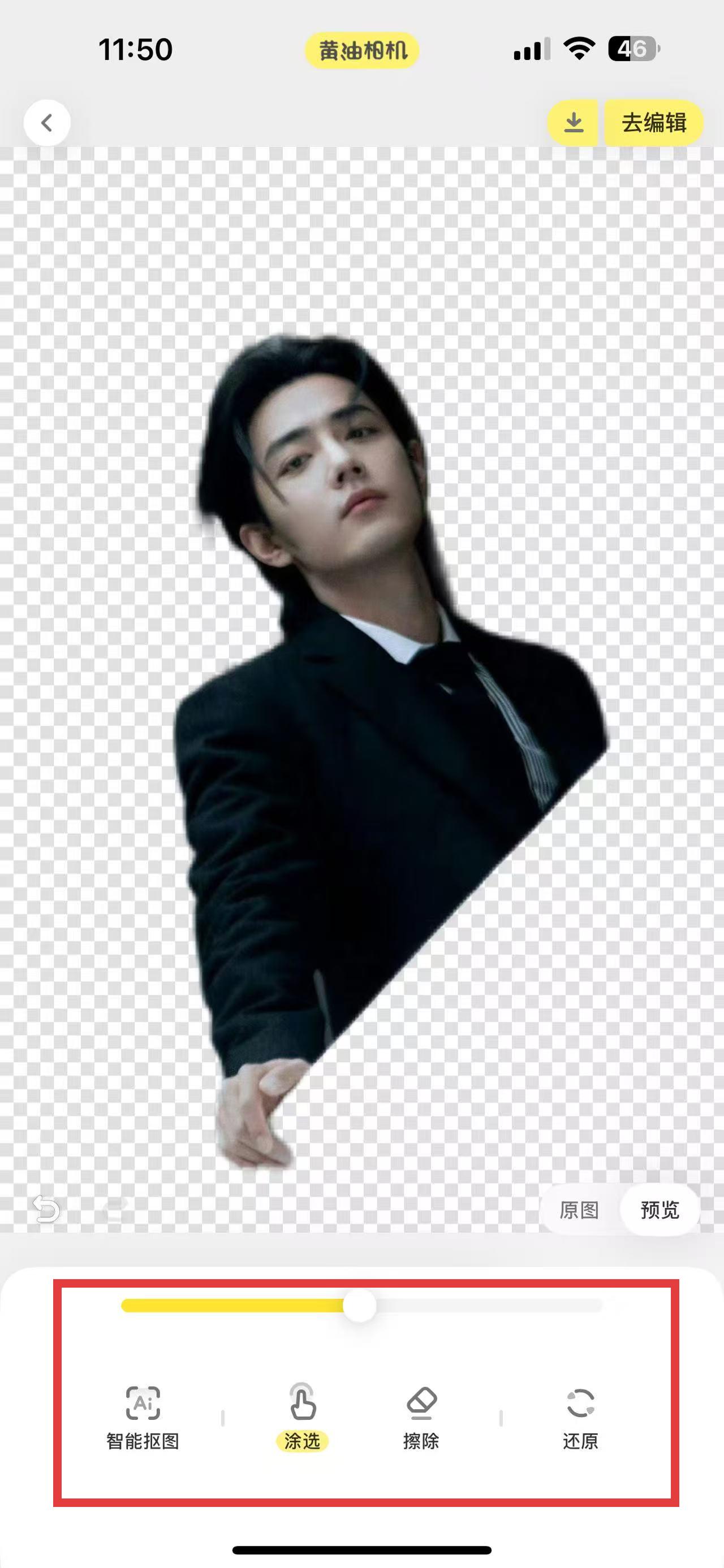 3、进入抠图界面后,利用智能抠图、涂选、擦除、还原等工具对图片主体进行抠取,抠取完成后点击去编辑,即可更换背景等进一步编辑操作。