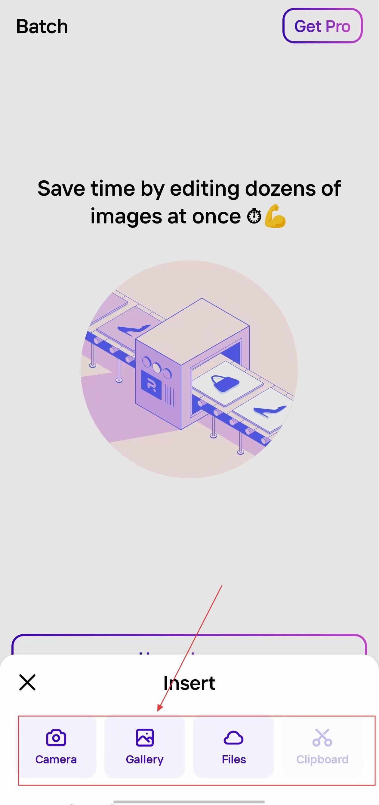 2、在弹出的Insert选项栏中,选择Gallery,从手机相册中选取需要批量处理的图片。