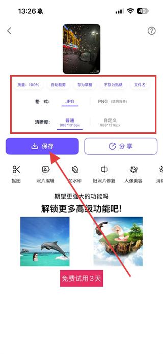 4、在保存设置页面选择格式、清晰度等参数后,点击保存,即可完成图片的导出操作。