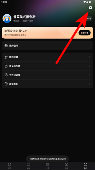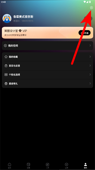 1、打开美图设计室应用,点击底部的我的选项,进入个人页面后点击右上角的设置图标。