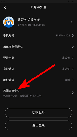 4、在账号与安全页面点击美图安全中心。