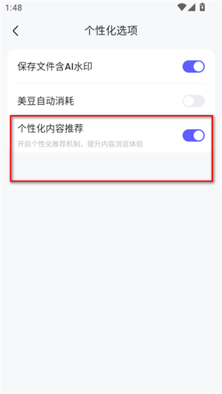 3、在个性化选项页面,找到个性化内容推荐对应的开关按钮并点击。