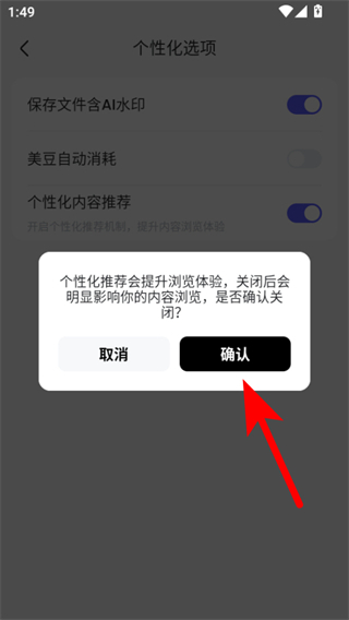 4、在弹出的确认提示框中,点击确认按钮,即可关闭个性化内容推荐设置。