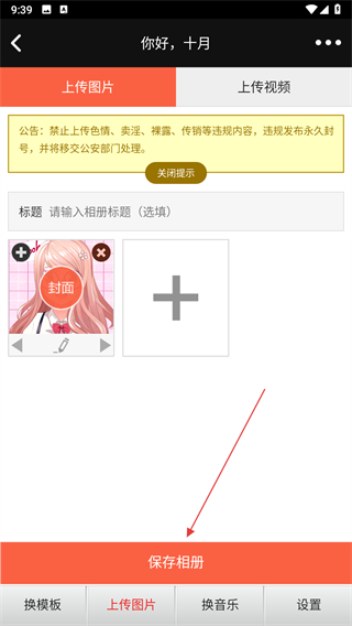 3、在上传界面,可选择输入相册标题,接着点击+号上传图片,图片上传好后,点击底部的保存相册按钮。