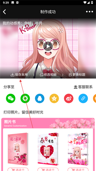 4、等作品制作成功,在制作成功的页面中,点击保存本地按钮,这样就能把动感秀保存到手机里了。