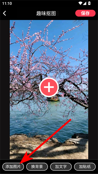 4、抠图完成后,还可进行换背景、加文字、加贴纸等操作,最后点击保存即可。
