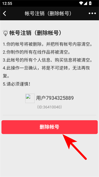 4、在账号注销页面阅读相关提示后,点击删除帐号按钮,即可完成账号注销操作。
