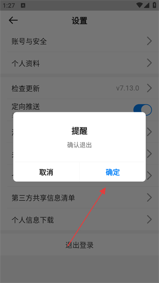 4、在弹出的提醒窗口中,点击确定,即可退出账号。