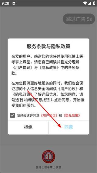 1、打开张博士app,在弹出的提示框中,点击同意。