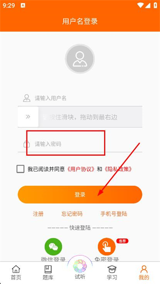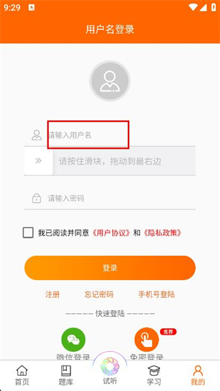 3、在登录页面中,填写用户名,拖动滑块完成验证。