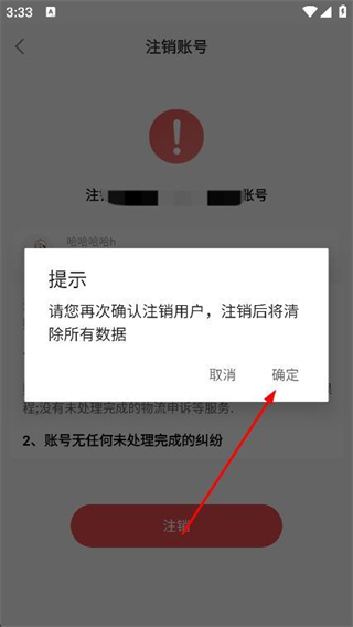 4、在弹出的提示窗口中,点击确定按钮,完成账号注销。