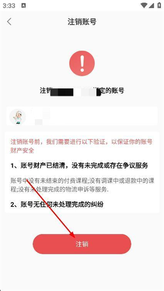 3、在注销账号页面,注意注销事项,点击下方注销按钮。