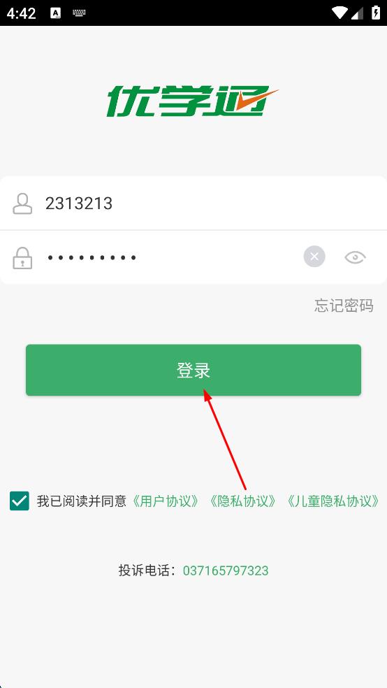 4、确认手机号、密码输入无误且已勾选同意协议后,点击“登录”按钮,即可完成优学通APP的登录操作。