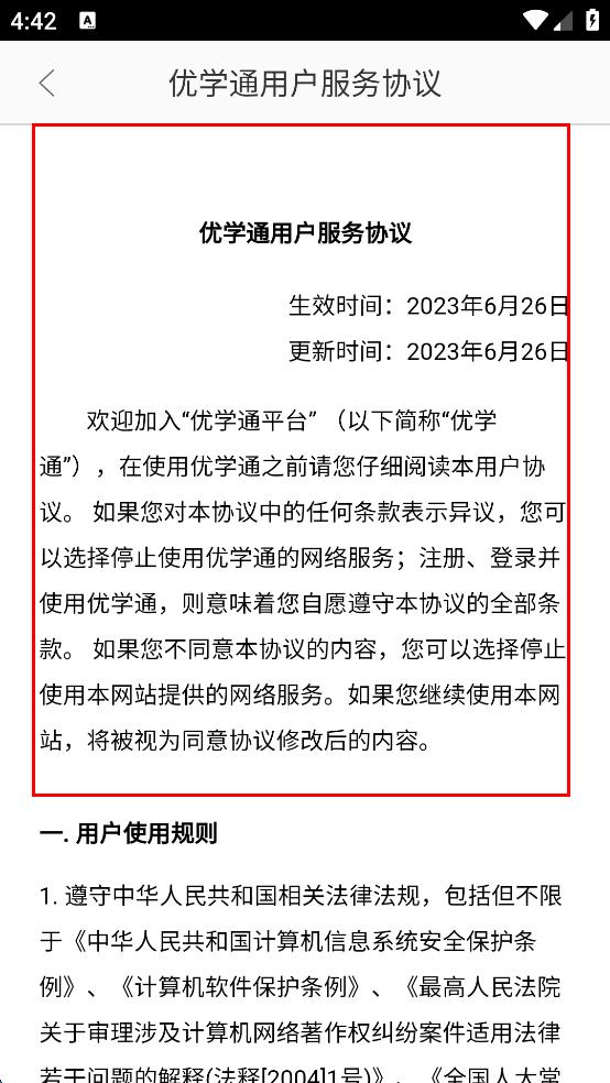 3、若需查看用户服务协议详细内容,可点击相关协议文字,进入优学通用户服务协议页面,仔细阅读协议内容后返回登录界面。