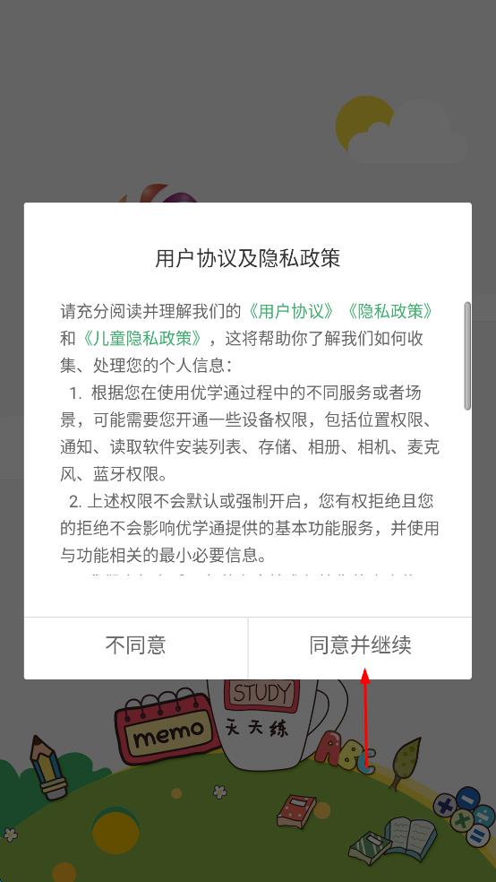 1、打开优学通APP,在用户协议及隐私政策页面,点击“同意并继续”,进入登录界面。