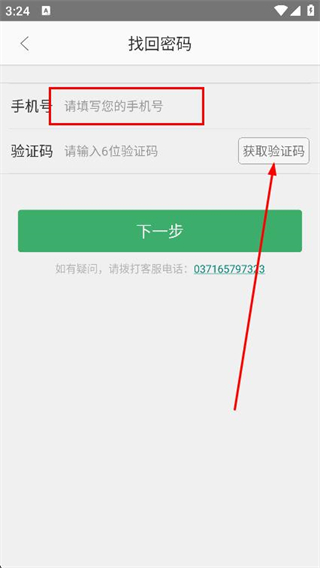 2、在找回密码页面,填写手机号,并点击获取验证码。