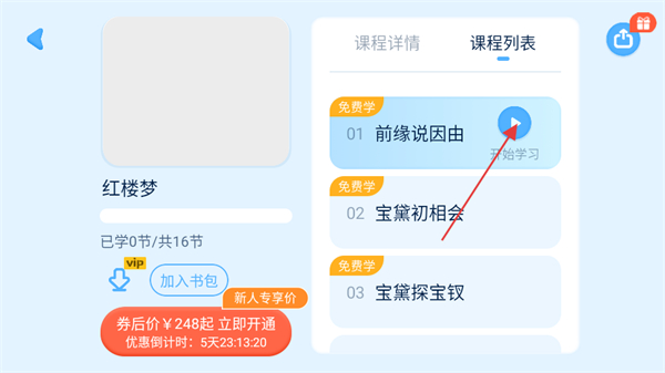 3、在课程详情页的课程列表中,点击对应课时的开始学习按钮,即可进入课程学习页面。