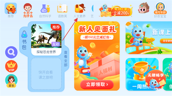 1、在ahakid启蒙首页,点击人文素养分类标签,进入对应课程列表页面。