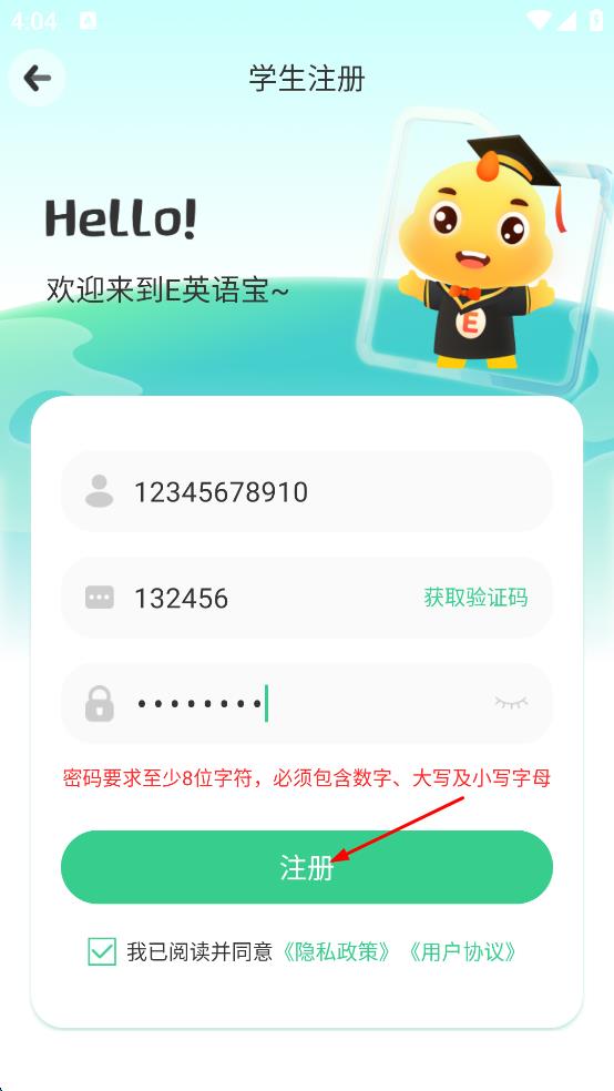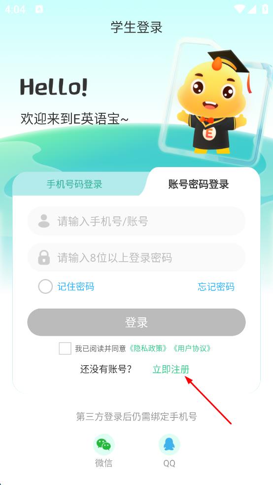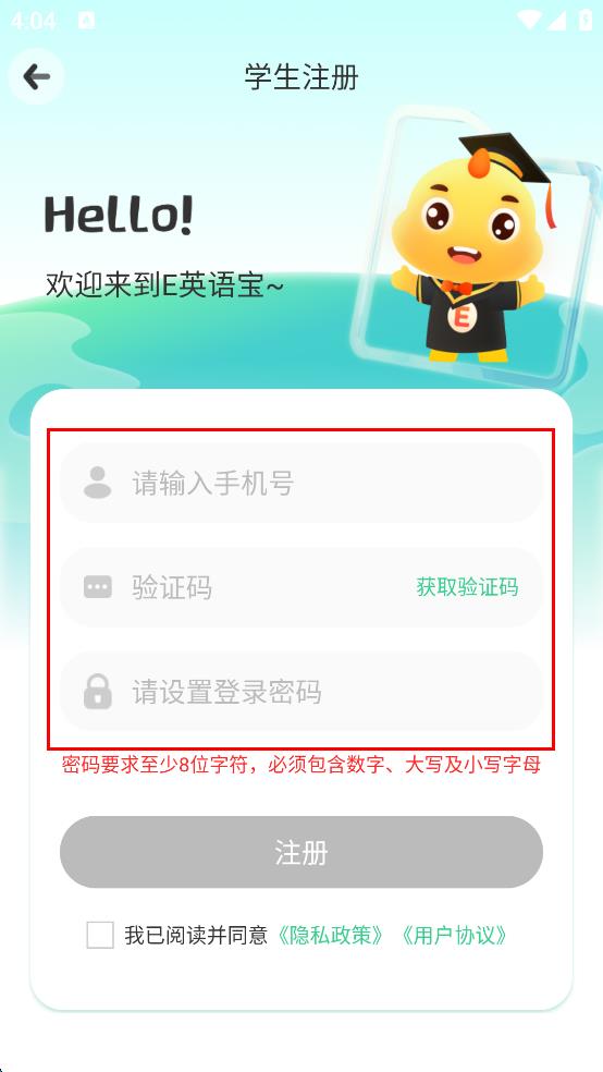 1、打开E英语宝,弹出隐私权政策和用户协议提示,点击同意,进入学生登录页面。