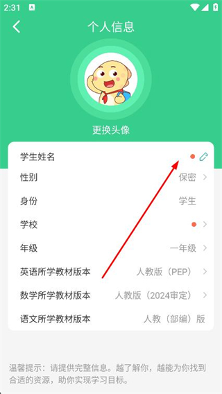 3、在个人信息页面中,点击学生姓名右侧的编辑。