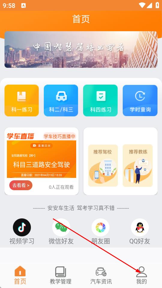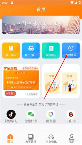 1、打开安安车生活APP,在首页点击学时查询按钮。