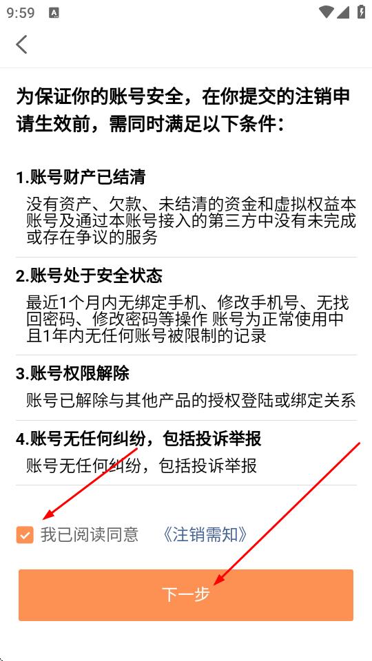 5、阅读注销账号需满足的条件,勾选我已阅读同意注销须知,点击下一步。