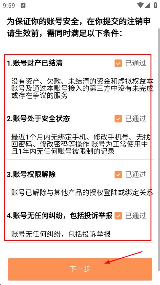 6、确认账号满足注销条件后,显示已通过,再次点击下一步。