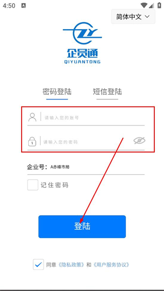 3、在登录页面的密码登陆栏,填写账号和密码,点击登陆,完成企员通的账号登录。