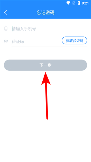 2、进入忘记密码页面,输入手机号和验证码,然后点击下一步。