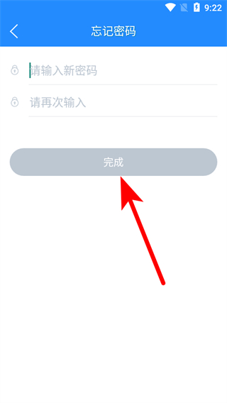 3、进入页面输入新密码后,点击完成,完成账号密码的找回操作。