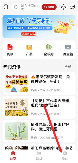 1、打开无限极APP首页,点击底部我的进入到个人中心页面。
