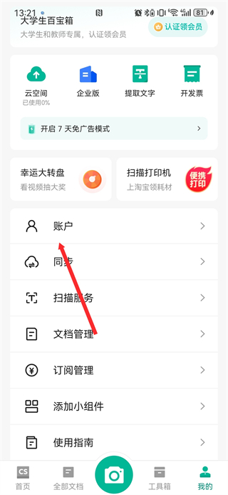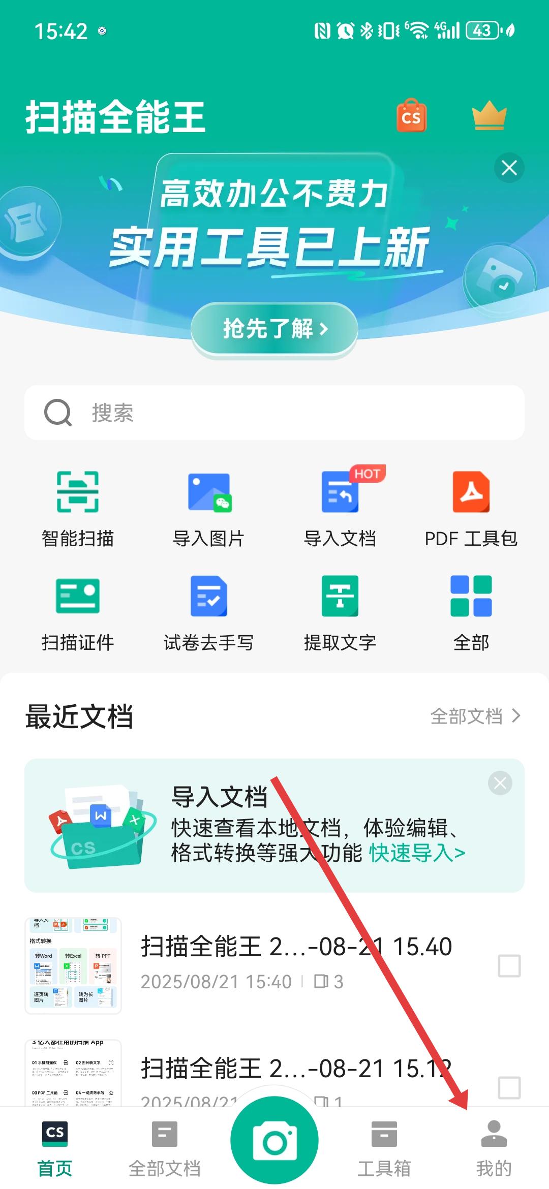 1、打开扫描全能王APP,点击右下角我的,进入个人页面。