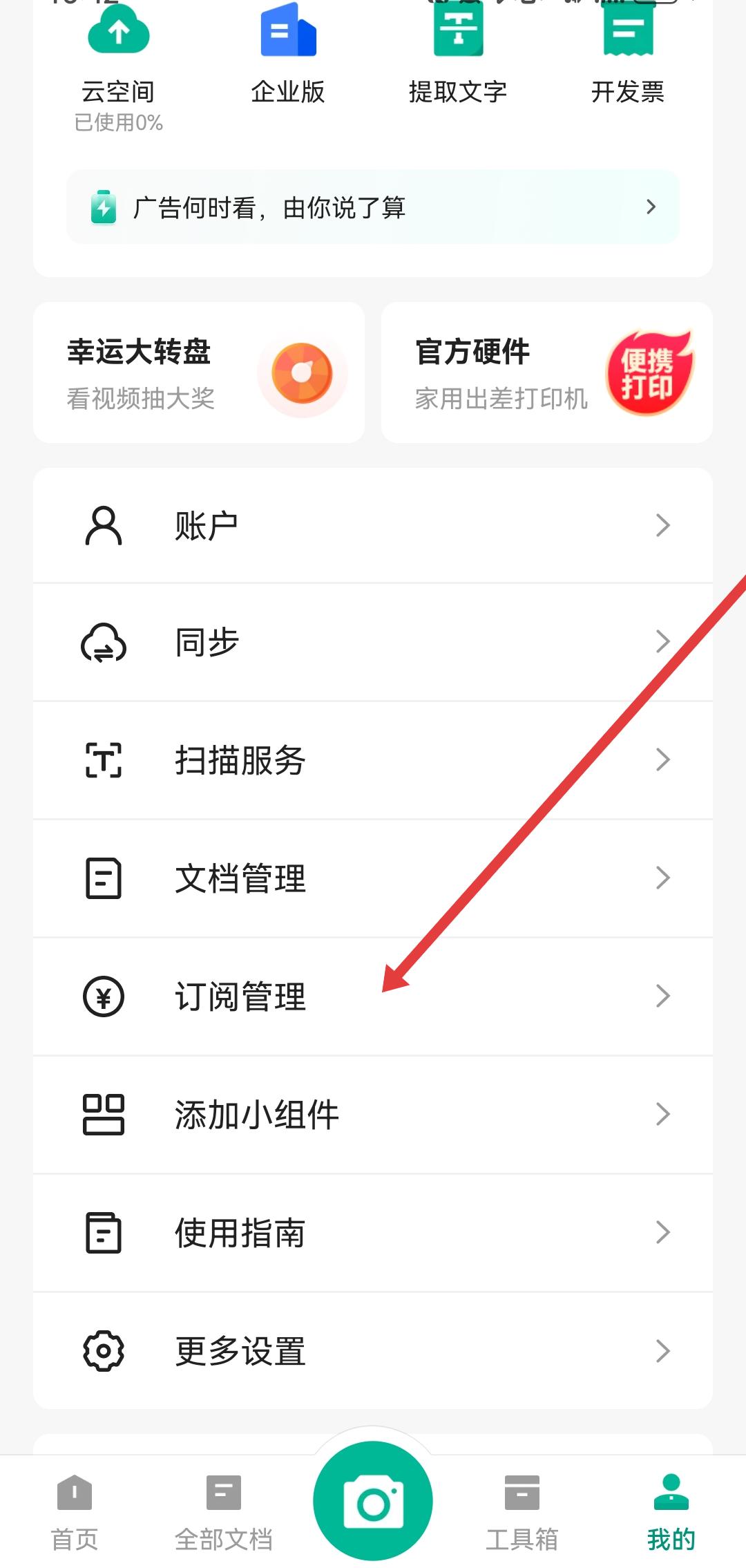 2、在个人中心页面,向上滑动屏幕,找到订阅管理选项图标位于文档管理下方,点击进入订阅页面。