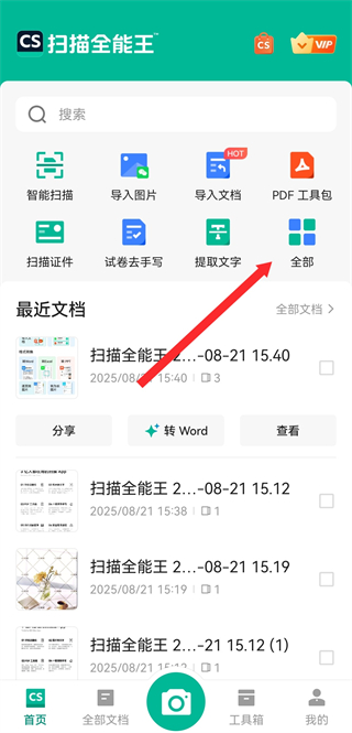 1、打开扫描全能王APP的首页,点击全部,进入工具箱页面。