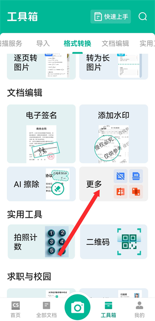 2、在工具箱的页面,需要点击更多按钮,展开功能的菜单。