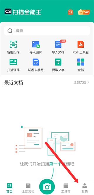 1、打开扫描全能王的软件进入首页后,点击底部导航栏最右侧的我的图标,进入个人中心的界面。