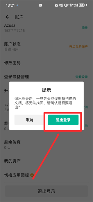 4、在弹出的提示对话框中,点击退出登录按钮,完成退出操作。