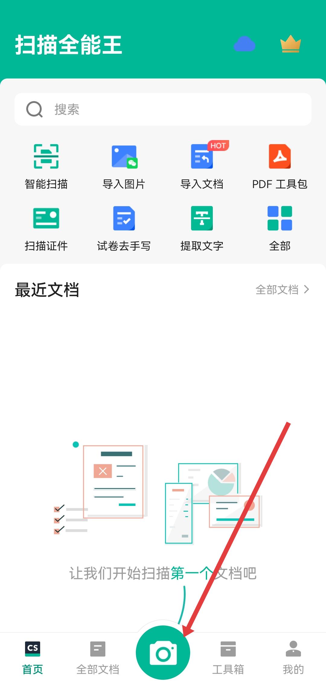 1、打开扫描全能王app,进入主界面后点击底部中间绿色相机图标,启动扫描功能,对准需扫描的图片拍摄。